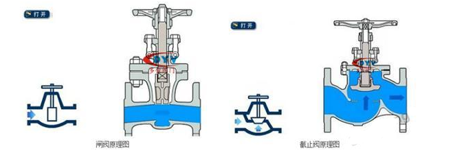 截止閥是低進高出,從外觀看有明顯的管道不在一相水平線上。閘閥流道在一個水平線上。閘閥的行程比截止閥的要大。