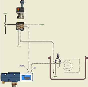 2、壓縮空氣通過(guò)限位閥至舉升閥氣腔,使舉升閥的P口和C口相通,高壓油進(jìn)入油缸;