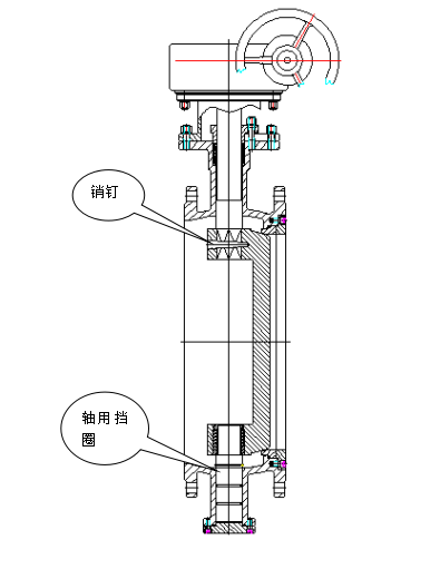 閥門裝配好以后上閥桿與球體之間用銷釘固定,下閥桿加裝一個(gè)軸用擋圈(如圖所示)(1)增加閥桿與球體直接的扭力減少閥門開關(guān)次數(shù)平凡造成的間隙;(2)松開鎖緊螺栓后,閥門在帶壓狀態(tài)下閥桿不會(huì)從閥體內(nèi)飛出。